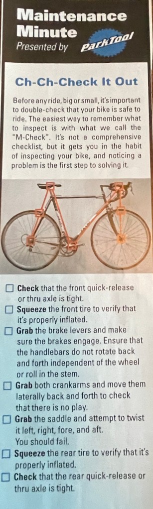 In a recent issue of Bicycling Magazine, Park Tool published a list of items to check before you ride. In this post, I’ll review those and add a few embellishments of my own.